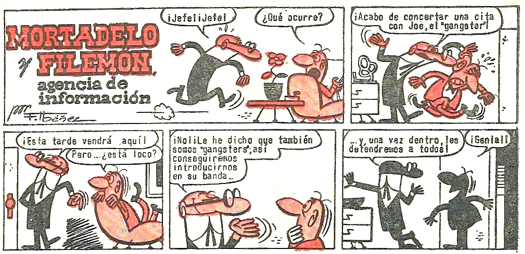 Mortadelo invita a Joe el "gángster" a la agencia de información para hacerle creer que ellos también son gángsters y lograr introducirse en su banda y así poder detener a muchos mafiosos. Filemón recibe a una persona ante la que se muestra como un ladrón de guante blanco y el tipo resulta ser un enjaulador de atracadores que trabaja para el FBI y que se lleva a prisión a Filemón.