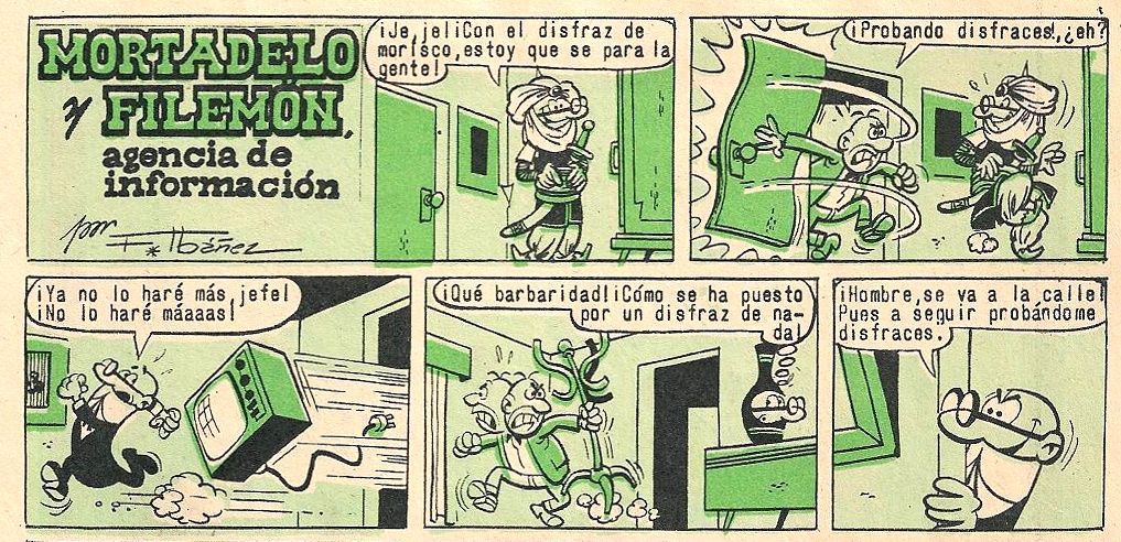 Mortadelo se está probando el disfraz de guerrero con su catapulta cuando oye llegar a su jefe con su cliente míster Dolarini, por lo que decide esconder ésta debajo del sofá. Pero cuando el millonario se siente en éste Filemón accionará sin querer el resorte que catapultará a aquel por la ventana y haciéndole precipitarse al vacío desde una altura de diecisiete pisos.