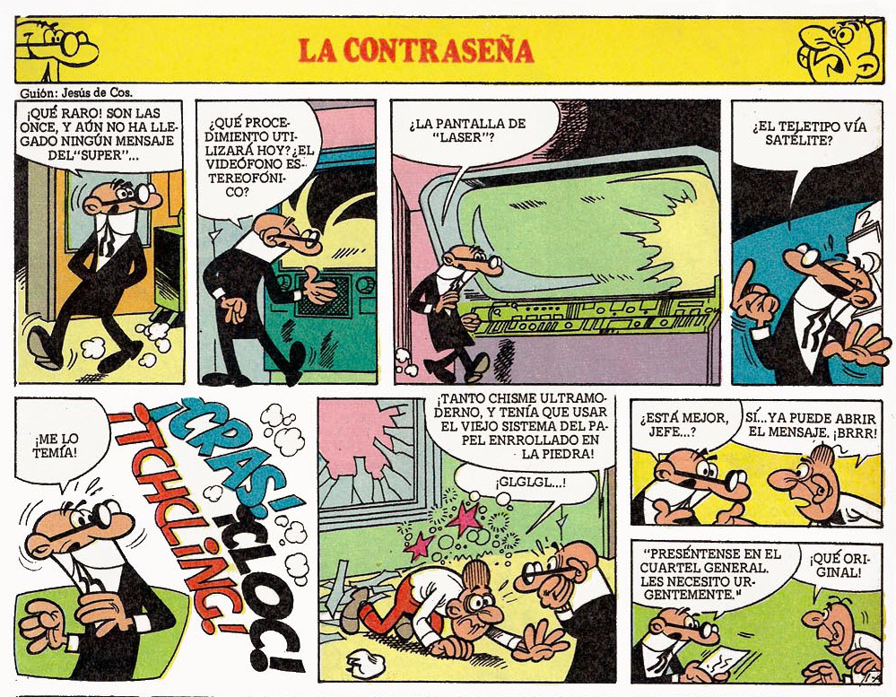 Mortadelo y Filemón han de presentarse urgentemente en el Cuartel General de la T.I.A., pero han olvidado la contraseña que da acceso al edificio. Los intentos que prueban con el vigilante de la entrada sólo les proporcionarán golpes y porrazos.