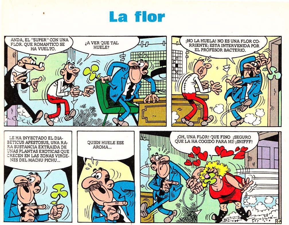 El profesor Bacterio ha inyectado en una flor el Diabéticus Apestosus, una rara sustancia extraída de plantas exóticas que crecen en las zonas vírgenes del Machu Pichu. Quien huele su aroma pierde todo su peso físico y queda como una pluma a merced de los cuatro vientos. El Bacterio no ha inventado aún el antídoto, pero la flor sale por la ventana de una corriente de aire y el Súper pide a Mortadelo y Filemón que traten de recuperarla a toca costa.