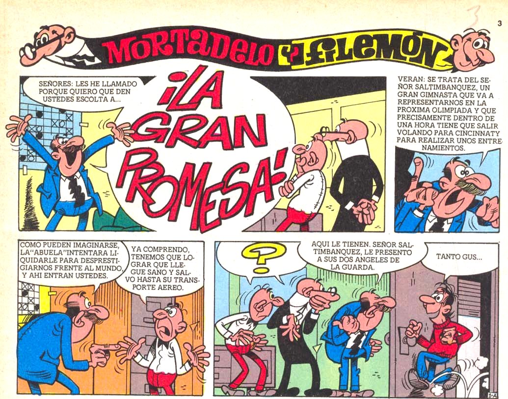 El gimnasta Saltimbánquez va a representar a la T.I.A. en las olimpiadas de Cincinnaty y el Súper pide a Mortadelo y Filemón que le protejan ante un inminente atentado de la A.B.U.E.L.A. contra el gimnasta.