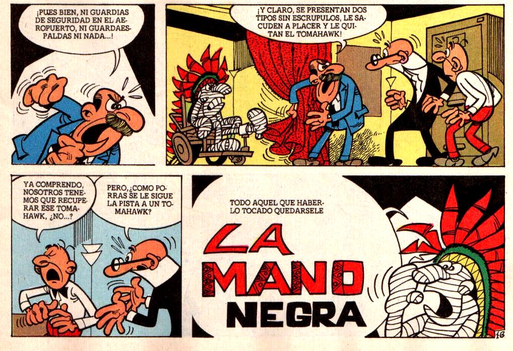 El gran jefe apache Toro Pitonero ha llegdo a nuestro país para ofrecer un Tomahawk forrado de piedras preciosas al museo de artes curiosas de la ciudad. Pero al llegar al aeropuerto no tuvo ninguna protección y dos tipos sin escrúpulos le robaron el tomahawk y le dieron una tremenda paliza. La maldición cayó sobre ellos, que tendrán desde entonces la mano negra y el Súper pedirá a sus agentes Mortadelo y Filemón que busquen a dichos granujas y recuperen el tomahawk de Toro Pitonero.