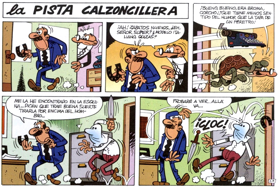 El Súper se ha encontrado una herradura e intenta lanzarla por encima de su espalda para que le dé suerte, sin embargo descubre en el intento que un encapuchado intenta asesinarle, zafándose en el último momento. Mortadelo y Filemón tendrán que seguir su rastro a partir de la única pista que el encapuchado ha dejado: un trozo de sus propios calzoncillos...