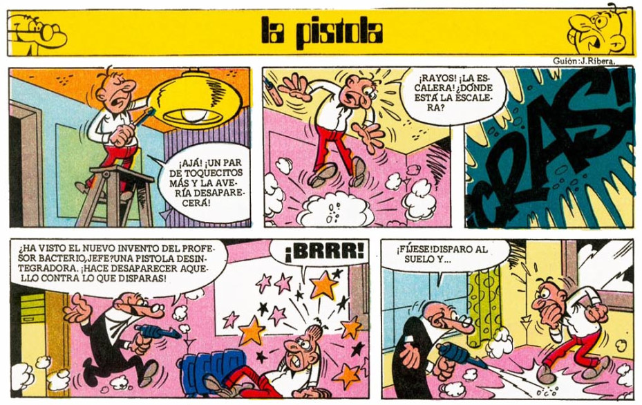 El profesor Bacterio ha inventado una pistola desintegradora que, en manos de Mortadelo y Filemón, no hará más que provocar desastres.