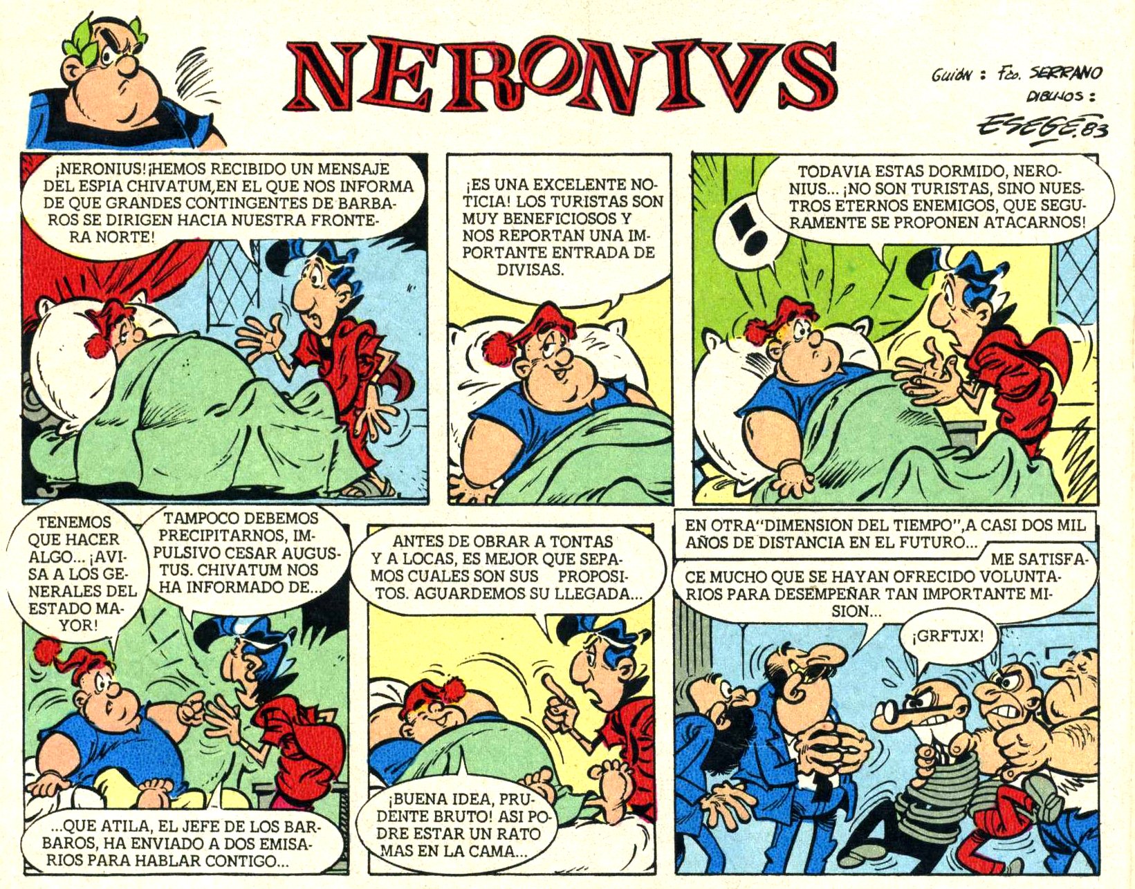 El profesor Bacterio ha ideado una máquina para viajar en el tiempo y el Súper decide estrenarla con Mortadelo y Filemón, que deberán viajar al pasado para capturar al banquero A.B.Jorro quien, para eludir la justicia, se fugó en una máquina parecida cargada de lingotes de oro refugiándose en la antigua Roma (exactamente en el año 40 de nuestra era). Allí deberán viajar Mortadelo y Filemón. La aventura es en realidad una aventura del personaje "Neronius" creado por Esegé en la que Mortadelo y Filemón aparecen como artistas invitados. Publicada en 1983, la aventura rinde homenaje a los personajes creados por Francisco Ibáñez en su 25º cumpleaños.