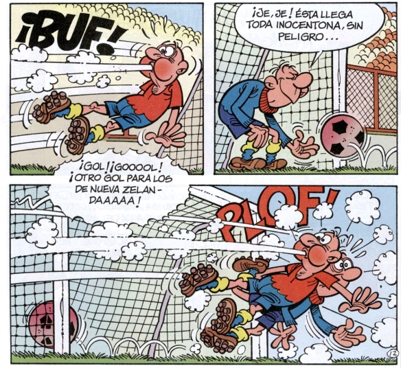 Aventura muy peculiar ya que es la única que Francisco Ibáñez realizó con tres tiras por página. El resultado podría no haberle convencido ya que jamás volvió a intentar realizar aventuras en este formato. La aventura se desarrolla en un mundial de fútbol en el que Mortadelo y Filemón se harán pasar por jugadores de la selección para probar un nuevo brebaje del profesor Bacterio que proporciona rapidez y agilidad a quien lo toma.