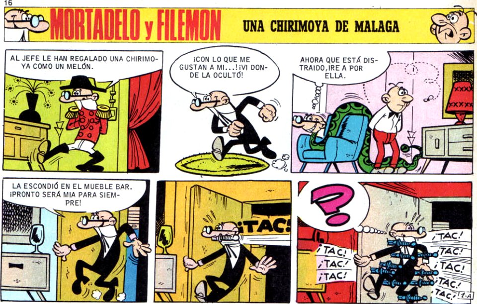 Mortadelo intenta asaltar a toda costa el mueble-bar de Filemón para hacerse con una chirimoya que le habían regalado pero fracasa una y otra vez. Versiona a parte de otra historieta realizada por Ibáñez para el Pulgarcito Extra Verano 1966 (también conocida como "El mueble-bar".