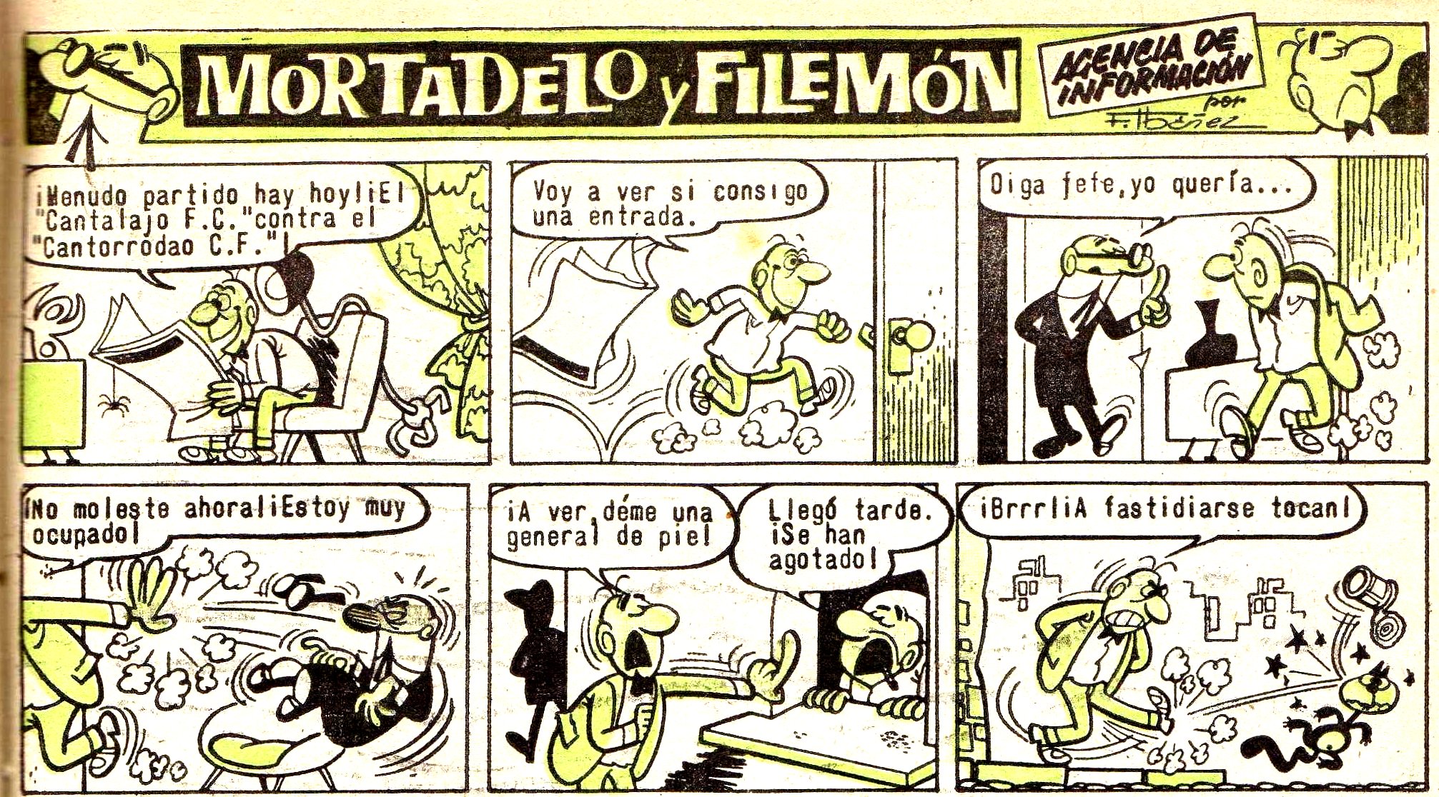 Filemón va corriendo a sacarse una entrada para ver el partido de el "Cantalajo F. C." contra el "Cantorrodao C. F." pero éstas se han agotado, por lo que vuelve a casa furioso y sin querer escuchar ni saber nada de una cosa que quiere decirle Mortadelo. Cuando ya pasa el partido y Filemón, algo más calmado, va a ver qué quería Mortadelo este le dice que tenía entradas para la tribuna de ese partido y que como él no tenía ganas de ir quería regalárselas.