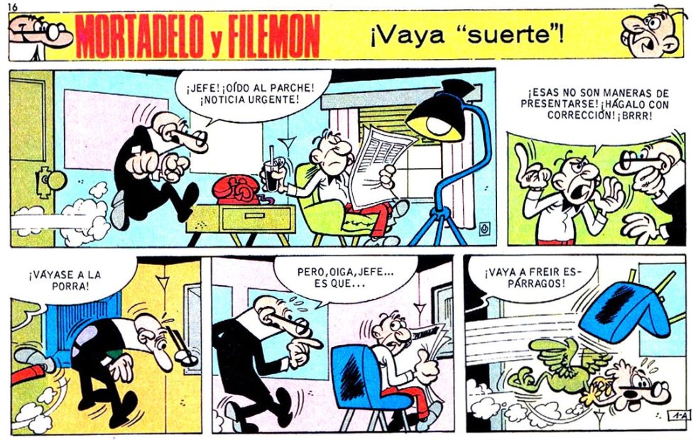 Mortadelo y Filemón trata por todos los medios de decirle a su jefe que les están "limpiando" el piso pero Filemón no le deja expresarse. Mortadelo avisa demasiado tarde... La historieta es una versión de Osete de otra realizada por Francisco Ibáñez para el Pulgarcito nº 1427.