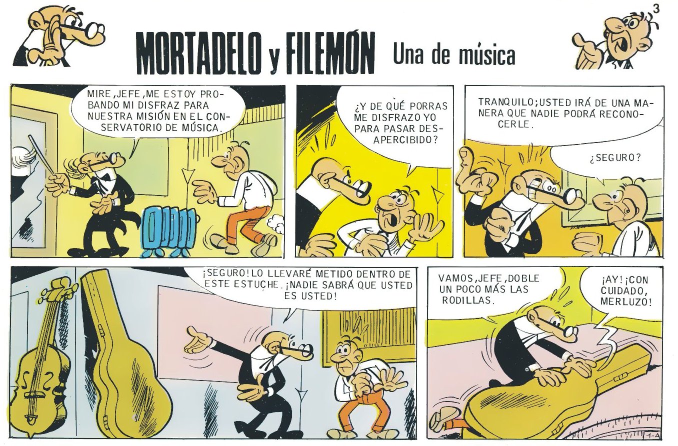 Mortadelo y Filemón tienen que realizar una misión en el conservatorio de música y Mortadelo decide llevar a Filemón en un estuche de violonchelo.