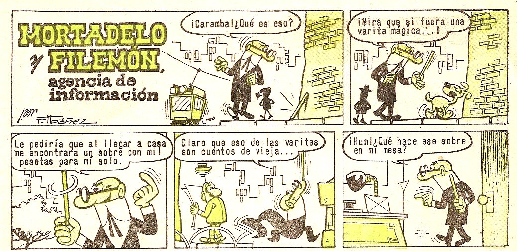 Mortadelo encuentra un palo en la calle que él toma por una varita mágica desde el momento en que desea encontrarse un sobre para él con cinco mil pesetas dentro y eso mismo es lo que luego ocurre. De esta manera, piensa en ir a detener a "Bull-Dog" convirtiéndolo en enano con su varita, pero eso no sucede y Mortadelo es apalizado por aquel. Luego descubre que las cinco mil pesetas eran de su jefe como un regalo por los diez años que había cumplido la agencia.