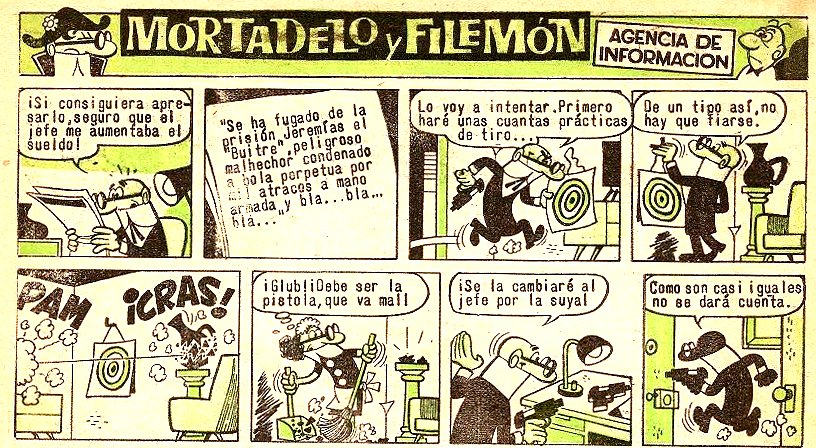 Mortadelo hace prácticas de tiro antes de ir a apresar a Jeremías "El Buitre", aunque como cree que su pistola va mal se la cambia por la de su jefe y sale a la calle con ella, pero en el momento en que se encuentra con Jeremías y lo apunta con la pistola, de ésta sale un cigarrillo y un encendedor, por lo que el villano no duda en apalearle. Para colmo, al regresar es apresado por la policía junto a su jefe, ya que éste le había pegado un tiro a su cliente Míster Dolarini cuando iba a ofrecerle un cigarro.