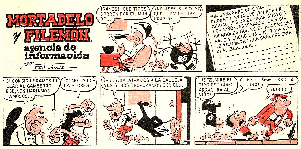 Al leer en la prensa que un gamberro se dedica a asustar a los niños diciendo que es el hombre del saco, metiéndolos y soltándolos luego siete kilómetros después, Mortadelo y Filemón deciden salir a la calle a capturarlo. Más tarde creerán haber dado con él al verlo llevando a un niño de la mano que llora, por lo que lo meterán en un saco y lo llevarán a rastras mientras dejan al niño en su casa pero al llegar éste les comenta que el hombre era su tío y que si lloraba era porque lo quería llevar al colegio.