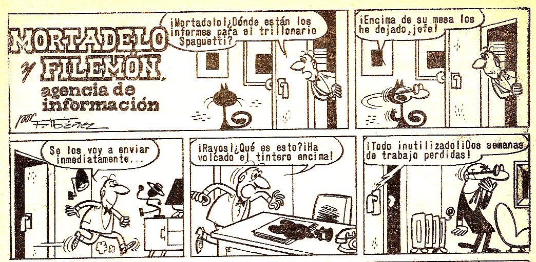Filemón se encuentra con una tremenda mancha de tinta sobre los informes del trillonario Spaguetti y culpa a Mortadelo sin saber que se trataba de una falsa mancha de tinta que el agente había adquirido en una tienda de artículos de broma.