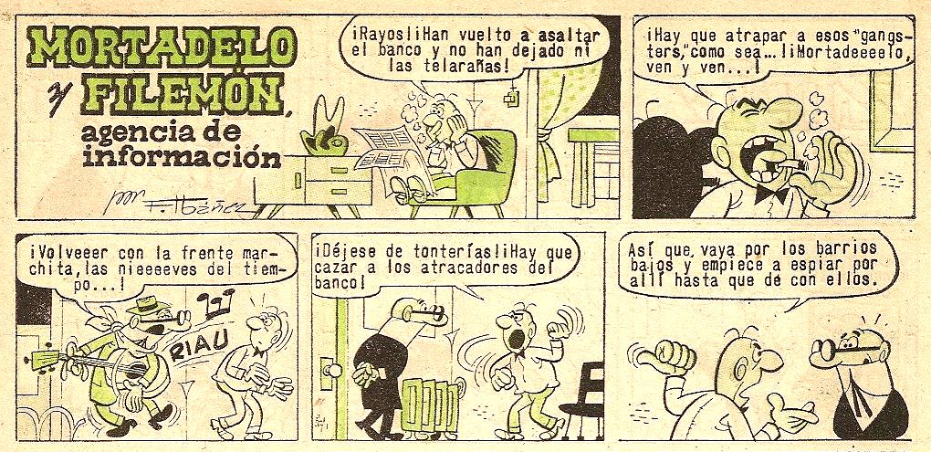 Filemón ordena a Mortadelo que vaya a espiar por los barrios bajos para que dé con los atracadores del banco que mencionan en el periódico. Pero Mortadelo regresa sin haber sacado nada en claro y Filemón le dice que traiga a un "soplón" que le pueda dar un buen soplo. Mortadelo se lo toma al pie de la letra y se presenta ante Mortadelo junto a un tipo fornido que aspira un montón de aire para darle un fuerte soplido a Filemón, a quien termina enviando más allá de los lejanos poblados de indios americanos.