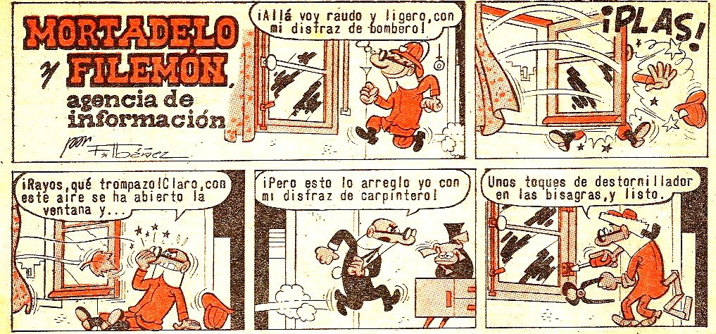 Como Mortadelo está harto de que el cristal de la ventana le golpee en la cara cuando ésta se abre de golpe a causa de las corrientes de aire decide cambiar el mecanismo para que esta se abra hacia fuera. Cuando Filemón regresa más tarde cansado a la agencia y se apoya en dicho cristal para descansar, la ventana se abrirá y caerá sin remedio al vacío.