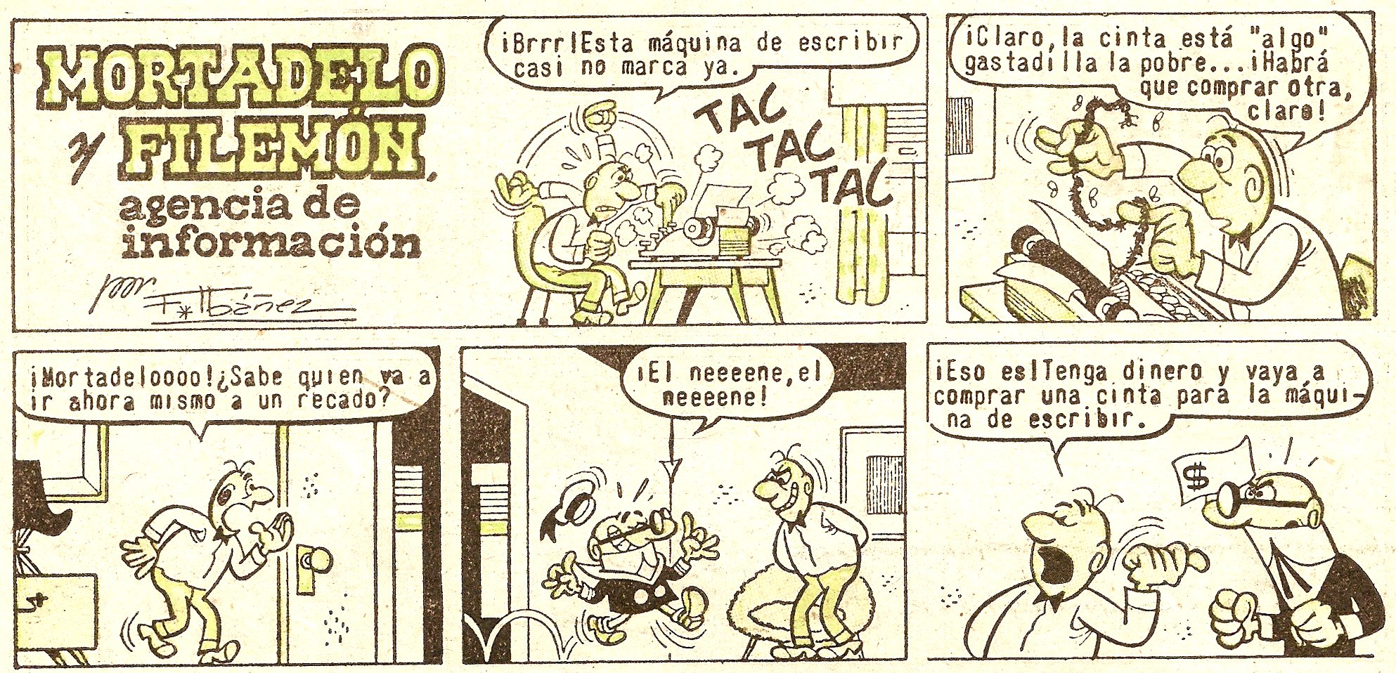 A Filemón se le ha roto la cinta de la máquina de escribir y envía a Mortadelo a comprarle una nueva, pero éste regresa con una cinta de regalo con la que envuelve la máquina de escribir.