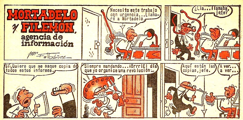 Filemón manda a Mortadelo que le saque copia de unos informes pero cuando se los trae de vuelta se enfada porque Mortadelo sabe de sobra que todo lo que él le pide lo quiere por triplicado. Al rato, un documento se le escapa volando a Filemón hasta la cornisa con tan mala suerte que al ir a cogerlo, se tropieza y se queda colgando de la misma. Filemón ordena a Mortadelo que le traiga una cuerda, pero éste tarda demasiado y al final Fillemón no aguanta más y cae al vacío. Poco después descubrirá que si Mortadelo había tardado tanto era porque había ido a comprar otras dos cuerdas a la tienda además de la que ya tenía, sabedor de que su jefe lo querría todo por triplicado.
