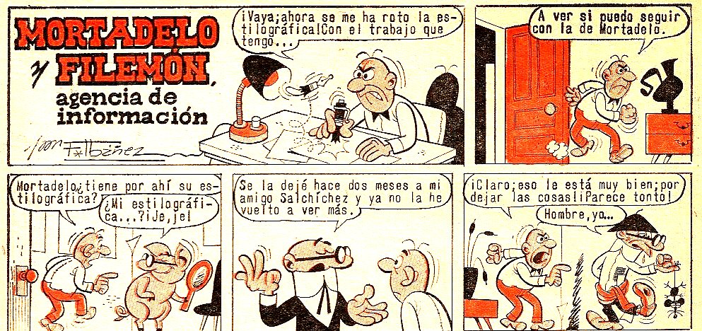 Filemón se queda sin estilográfica y Mortadelo le dice que él tampoco tiene la suya desde que se la dejó a su amigo Salchíchez y éste nunca se la devolvió. Filemón le dice que si no quiere que le pase eso tiene que hacer como él y no dejar nunca nada a nadie. Al rato, Filemón manda a Mortadelo a que salga a repartir los informes del día y como ve que tarda mucho en volver se asoma a la ventana y lo ve discutiendo con un tipo, el cual termina empujándolo enfadado a un charco y llenándolo todo de barro. Cuando Mortadelo sube, le explica que le ha pasado eso por seguir su consejo: aquel tipo le había pedido que le dejara pasar y él le había dicho que no, porque él le había dicho que no dejara nada nunca a nadie.