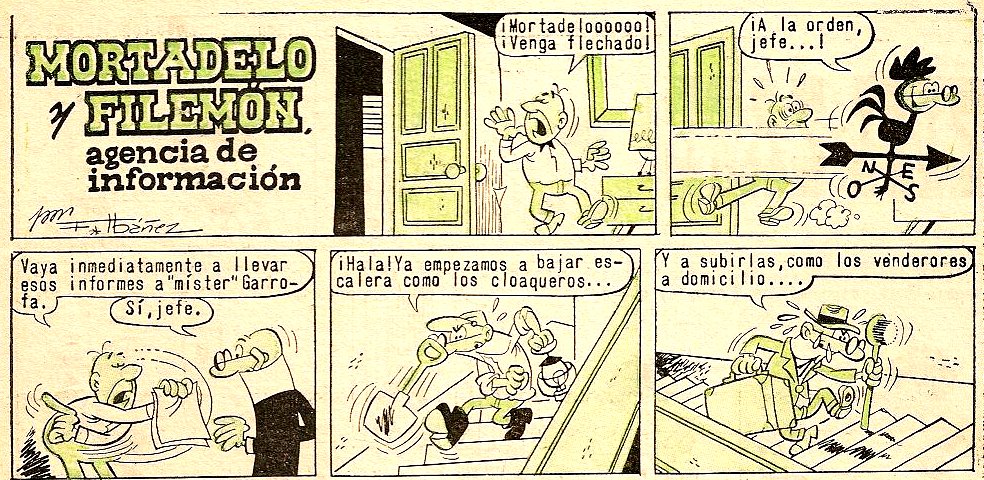 Filemón no hace más que mandarle recados a Mortadelo que le obligan a subir y bajar las escaleras contínuamente (llevarle unos informes a míster Garrofa, comprarle tabaco, traerle cerillas, subirle un café…) Como acaba con dolor en las rodillas Filemón le dice que eso es flojedad en los huesos y que lo que le conviene es subir y bajar muchas veces al día las escaleras para fortalecer los músculos.