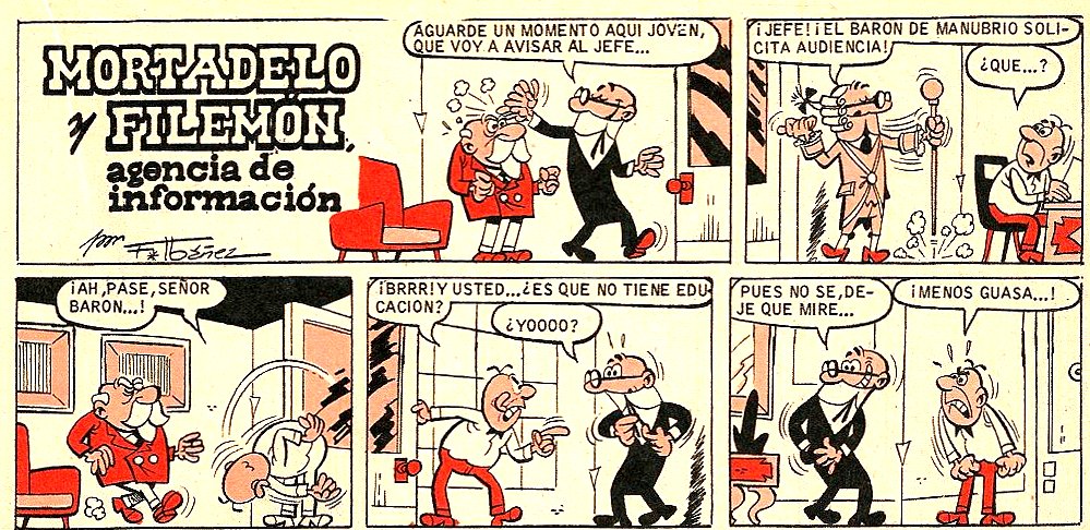 Filemón riñe a Mortadelo por haber hecho esperar de pie al barón de Manubrio y le advierte que ha de ofrecer siempre el sillón venga quien venga. El problema será cuando más tarde éste vea que el sillón no está y Mortadelo le explique que se lo ha ofrecido a un hombre que había venido pidiendo limosna.