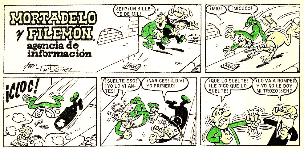 Mortadelo y Filemón se encuentran un billete de mil en la calle y, como no se ponen de acuerdo en quién lo ha visto primero, deciden engancharlo en la rama de un árbol y retroceder veinte pasos para que se lo quede el que venga corriendo más rápido a él. Pero cuando aprieten a correr y lleguen al árbol verán que otro tipo lo ha visto también y ya se lo lleva consigo.