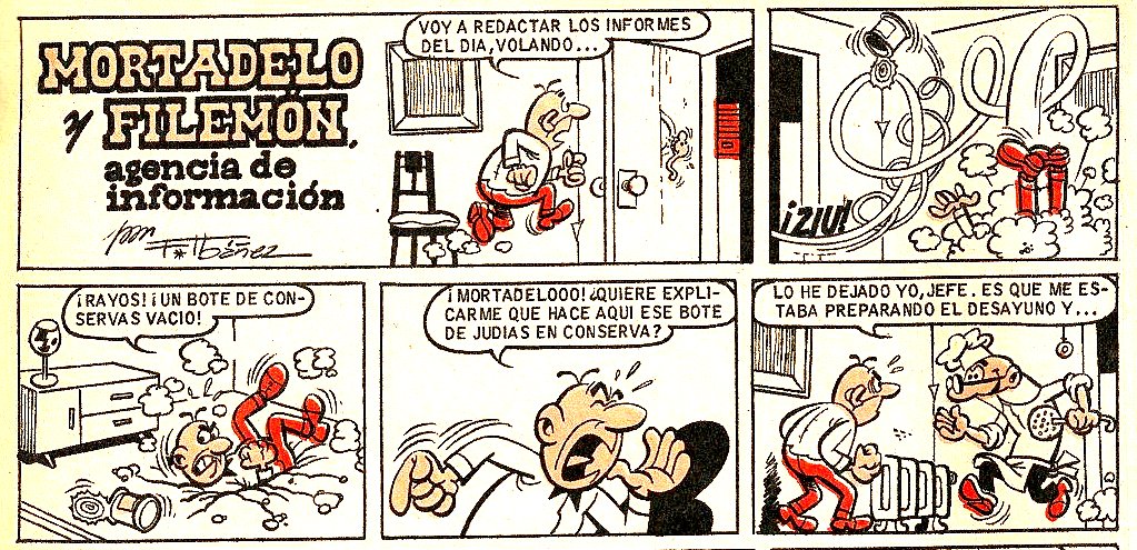 Filemón riñe a Mortadelo por haberse dejado en mitad del despacho un bote de conservas vacío con el que ha terminado tropezando. Al rato, vuelve a tropezar con el mismo bote y furioso, tira el mismo por la ventana, pero es entonces cuando Mortadelo le dice que en dicho bote había guardado para despistar a los cacos unas fórmulas valiosísimas que el científico Piedropómez les había traído para que se las custodiaran.