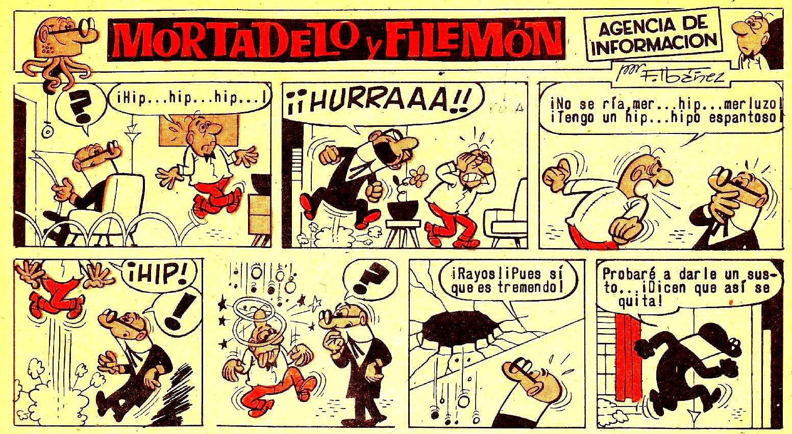 Mortadelo intenta quitarle el hipo a su jefe asustándole con diferentes disfraces (el de brujo africano, el de murciélago…). Finalmente prueba el de serpiente, pero asusta sin querer a Míster Popesko, el mejor cliente de Filemón.