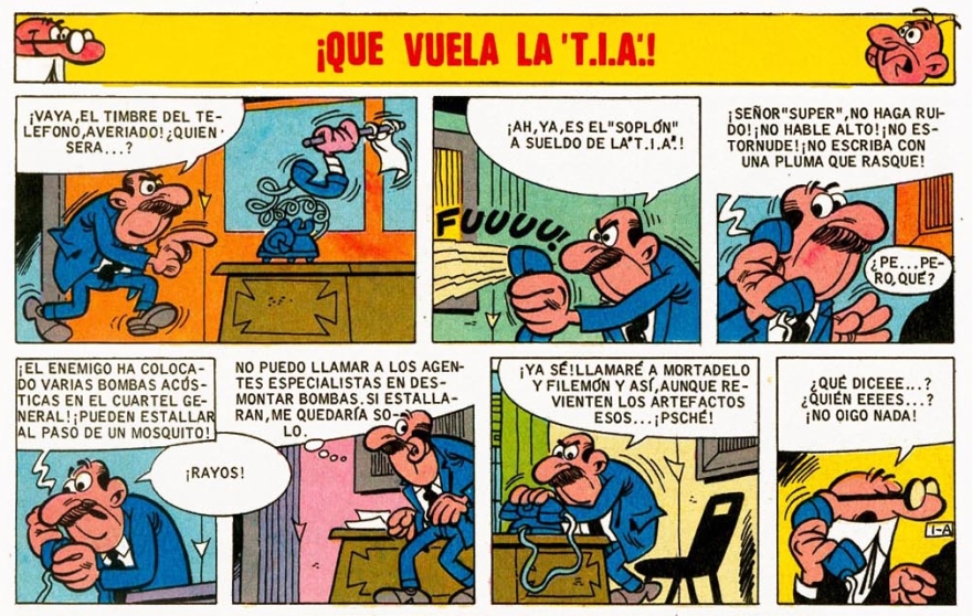 El soplón a sueldo de la T.I.A. informa al Súper de que el enemigo ha colocado varias bombas acústicas en el cuartel general de la mencionada organización. El Súper contará con Mortadelo y Filemón para desactivarlas aunque estos deberán ser especialmente cautos y silenciosos para evitar que las bombas explosionen.
