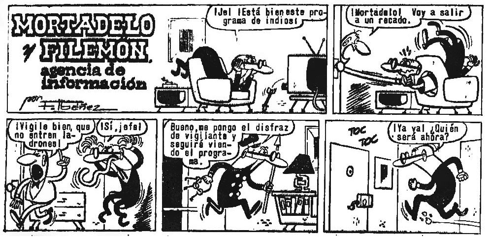 Filemón se marcha de casa dejando a Mortadelo al cargo de la vigilancia para evitar que entren cacos. Poco después un hombre que dice ser quien les vendió la televisión propone a Mortadelo reajustar la antena y le pide que suba al tejado mientras él aprovecha para desvalijar la vivienda.