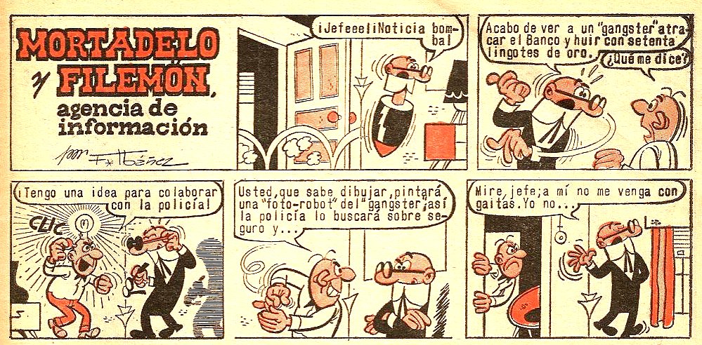 Mortadelo llega a la oficina contándole a su jefe que ha visto cómo un gángster ha atracado el banco y ha huído con setenta lingotes de oro. Filemón le comenta que dibuje una foto-robot de dicho gángster para poder colaborar con la policía y, aunque Mortadelo no está muy convencido de que sea buena idea, finalmente lo hace mientras Filemón llama al jefe de policía para que venga. Pero, cuando éste llegue y Mortadelo le entregue el dibujo, verán que lo ha dibujado tal como lo vio: completamente de espaldas.