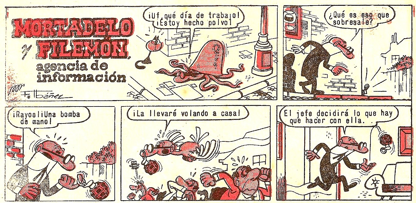 Mortadelo se encuentra una bomba de mano y la guarda en un cajón pero comete el error de dejar junto a ella el cartel de la entrada, roto, en el que reza: "Tiren de la anilla".
