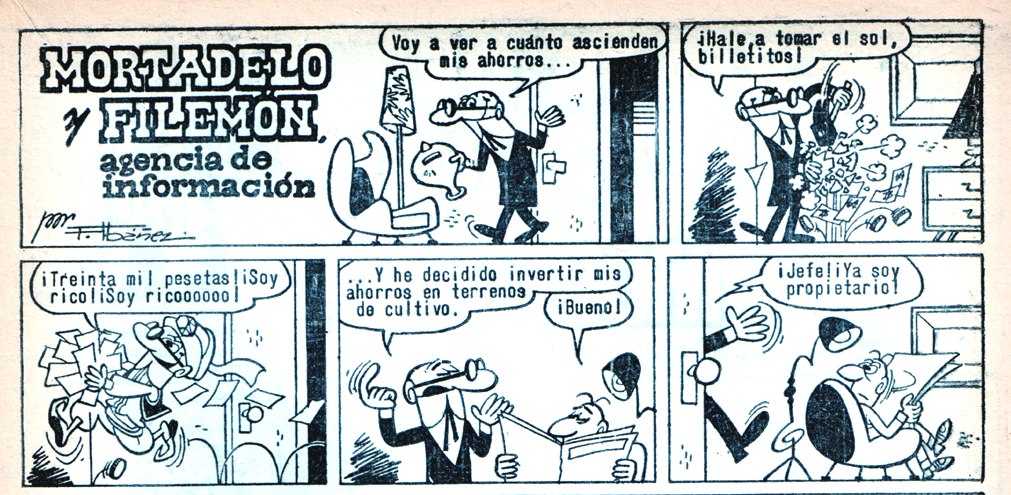 Mortadelo consulta sus ahorros y ve que ascienden a treinta mil pesetas. Con parte del dinero decide comprarse un terreno de cultivo de cuatro kilómetros cuadrados, que resulta ser un pedregal improductivo. Con el dinero restante compra otro terreno con una laguna,también impracticable como campo de cultivo. Mortadelo decide combinar ambos terrenos para solucionar el problema.