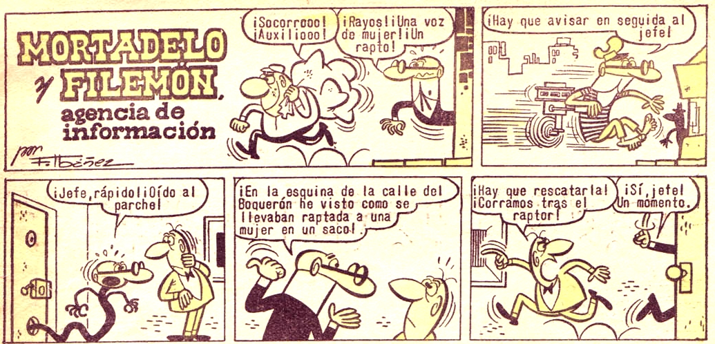 Mortadelo contempla en plena vía pública como un hombre secuestra a una mujer. Lo comenta con Filemón e inmediatamente se ponen tras la pista del secuestrador.