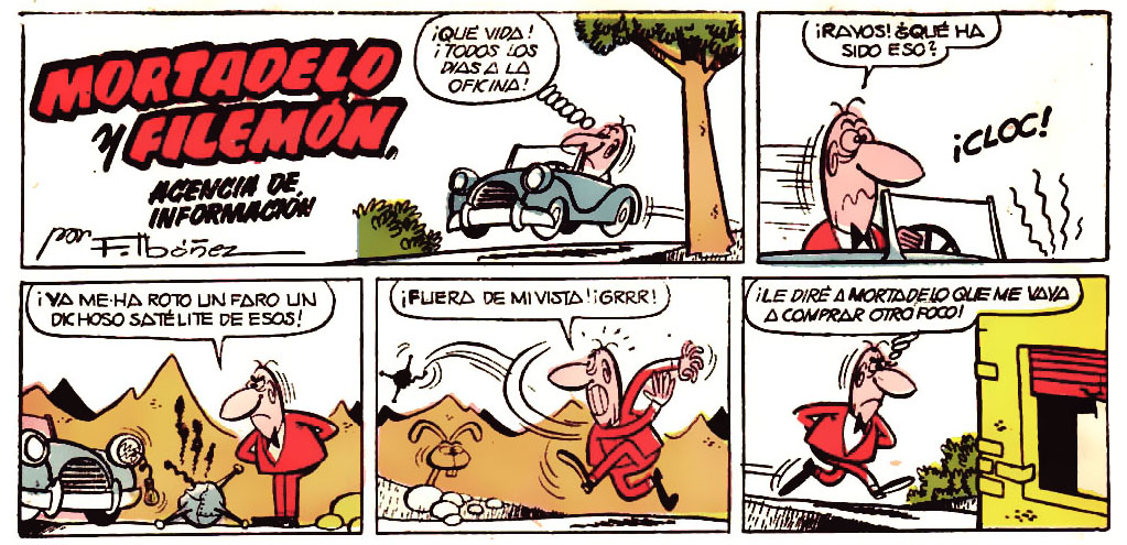 Mientras conducía en su coche Filemón tiene un percance: un satélite artifical choca contra su coche y le rompe el faro. Filemón le encarga a Mortadelo que le compre un foco y éste se presenta con una foca macho en la oficina.