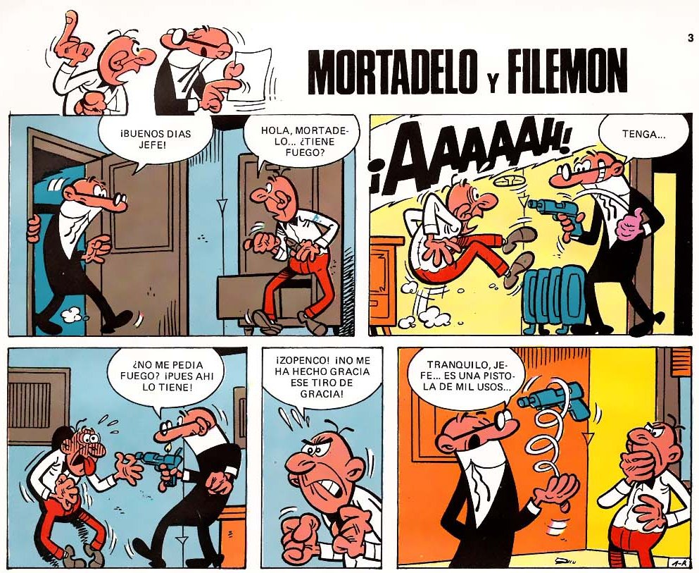 Mortadelo muestra a Filemón las ventajas de su última adquisición: un arma múltiple capaz no sólo de disparar sino de hacer las veces de abanico, lima, cepillo de dientes, vaporizador, desodorante... Pero, a pesar de todas sus ventajas, cuando el Súper la eche mano para liquidar a unos ladrones que intentaban robar en la caja fuerte de la organización no será capaz de usarla con propiedad y terminará haciendo que la pistola también funcione como "aperitivo", tras hacérsela tragar a Mortadelo.
