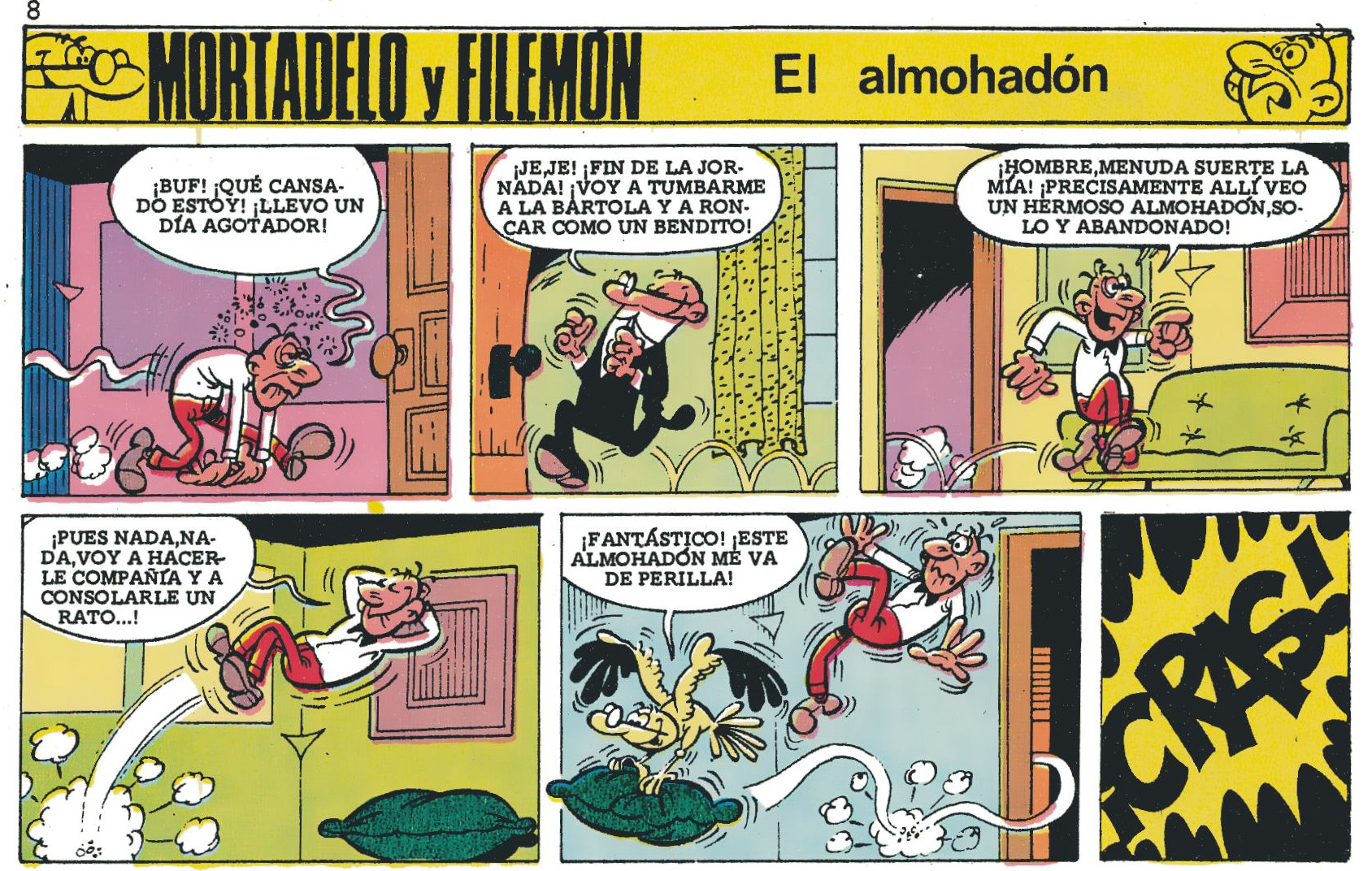 Mortadelo y Filemón están rendidos y harán todo lo posible por hacerse con el único almohadón que queda por las dependencias de la T.I.A.