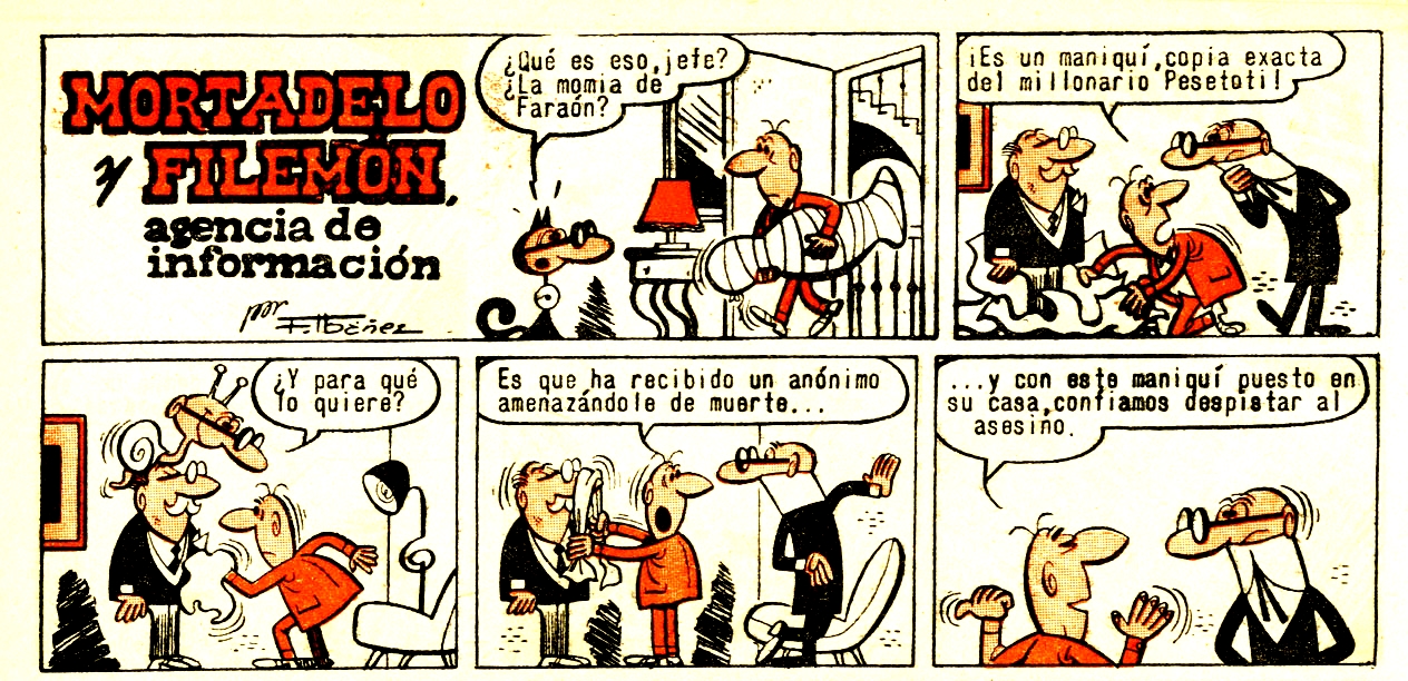 Filemón se presenta ante Mortadelo con una reproducción exacta del millonario Billetoti con idea de confundir a los villanos que le han amenazado de muerte. Mortadelo se toma a broma la situación y se parte de risa ante su jefe, que resulta ser una estatua de cera que confunde a Mortadelo por completo.