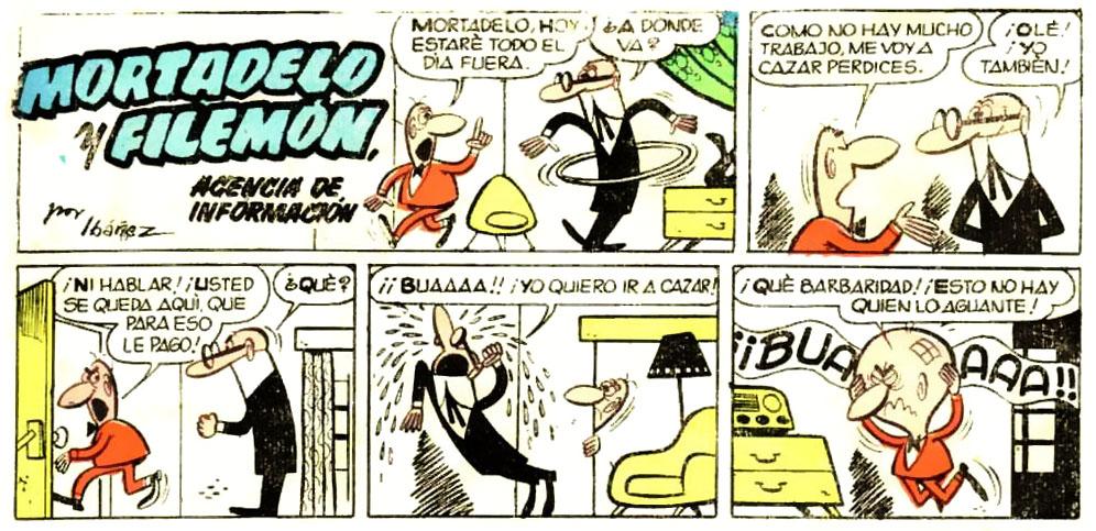 Filemón se quiere ir a cazar perdices y pretende dejar a Mortadelo en casa pero éste se pone tan triste que al final accede a que le acompañe en la cacería.