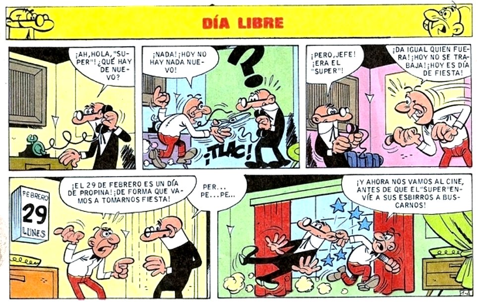 Es veintinueve de febrero y Filemón decide que se tomarán el día libre. Junto a su compañero Mortadelo deciden ir al cine antes de que los esbirros del Súper acudan a buscarlos pero serán dos esbirros de Bill el "Tarumba" los que intenten atraparlos. El Súper no será capaz de avisarles para que no salgan de casa...