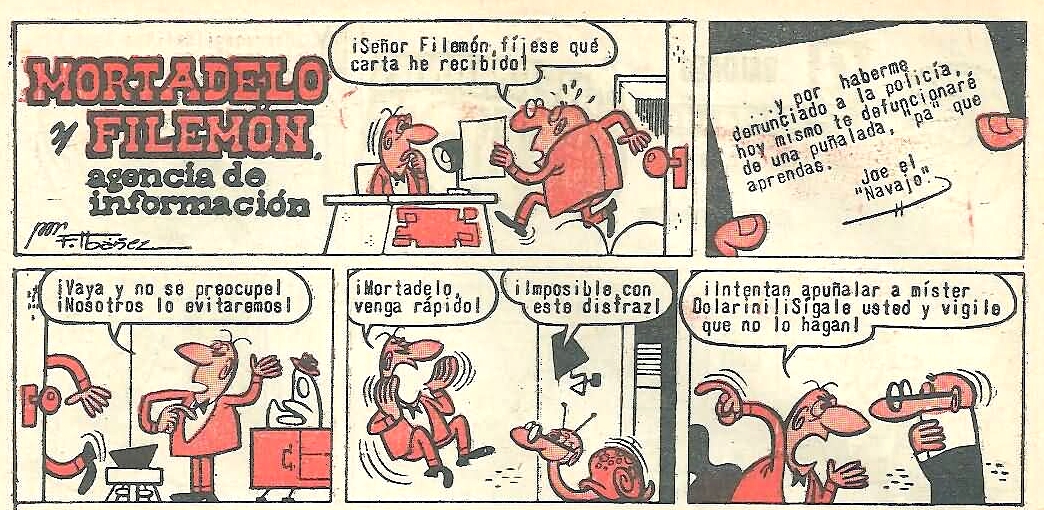 Un hombre se acerca a la agencia de información con una carta en la que Joe el "Navajo" le amenaza de muerte por denunciarle a la policía. El tipo pide ayuda a Mortadelo y Filemón pero Mortadelo no mueve ni un dedo por evitar la tremenda paliza que el "Navajo" le da al cliente.