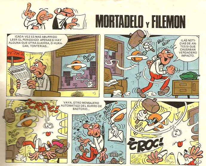 El Súper ha recibido un chivatazo según el cual van a atracar el hipermercado "Bodeguicentro" y pide a Mortadelo y Filemón que acudan al lugar para protegerlo.