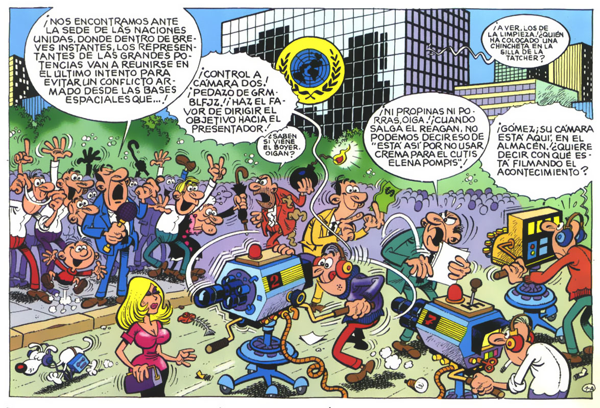 En la sede de las Naciones Unidas se reúnen las grandes potencias para evitar entrar en guerra. Destaca al comienzo la tensa reunión de la Asamblea General de la ONU. Los líderes estadounidense y ruso, Ronald Reagan y Konstantin Chernenko, aparecen como dos personas de gran edad y con múltiples achaques. Los líderes de la asamblea no se ponen de acuerdo y las naciones se preparan para la guerra iniciando el lanzamiento de estaciones orbitales. España no piensa quedarse atrás y va a realizar un proyecto para enviar al espacio una base espacial. Mortadelo y Filemón serán los futuros astronautas del proyecto.
