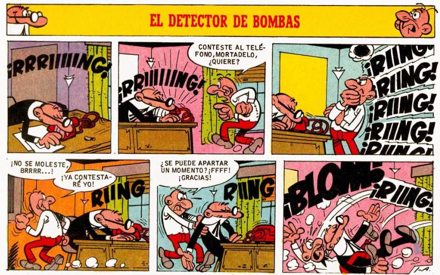 El Súper presenta a Mortadelo y Filemón un detector y desactivador de bombas ideado por el Profesor Bacterio. El invento arroja un líquido neutralzador sobre el explosivo para neutralizarlo. Lamentáblemente el detector no funciona como se esperaba de él y los agentes tendrán que intentar recuperarlo después de que saliera volando por la ventana utilizando la hélice que lleva incorporada.