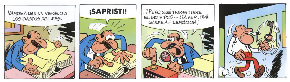 El Súper revisa los libros de cuentas de la organización y se sorprende al ver las desmesuradas cantidades de dinero que Mortadelo y Filemón han recibido de manera injustificada. Por ello los manda acudir a su despacho para pedirles explicaciones y exigirles medidas de ahorro de cara al futuro...