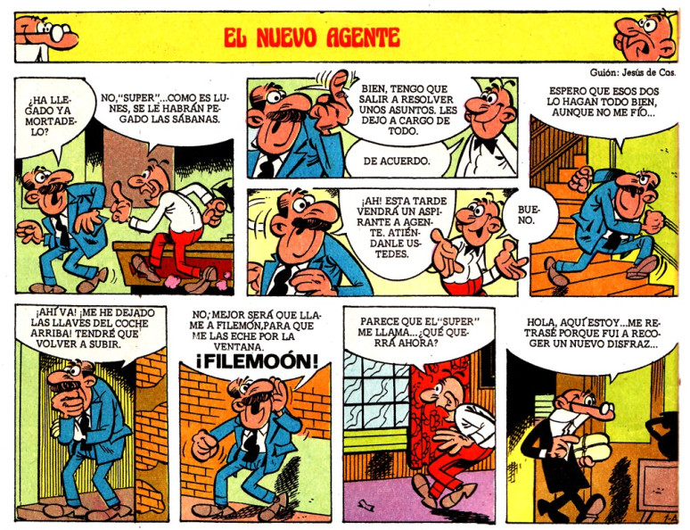 El Súper tiene que ausentarse de la oficina durante un rato y deja a Mortadelo y Filemón al cargo de la misma. Les comenta que recibirán la visita de un nuevo agente en la organización al que deberán atender.