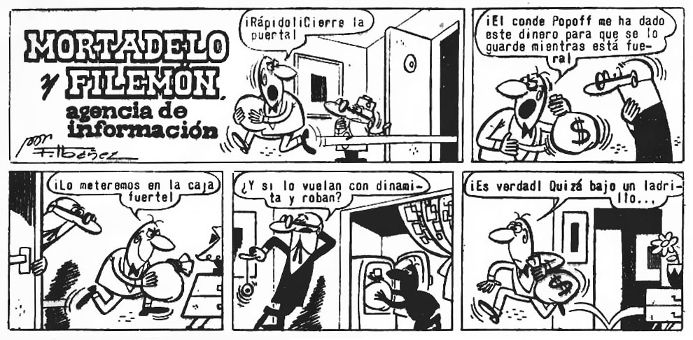 El conde Popoff ha entregado a Filemón una bolsa con dinero para que la custodie. Filemón plantea guardarla en sitios seguros (una caja fuerte, en algún cacharro de la cocina...) pero Mortadelo encuentra argumentos para desbaratar sus planes y termina enterrando la bolsa en medio del jardín e indicando con un cartelito el lugar exacto...