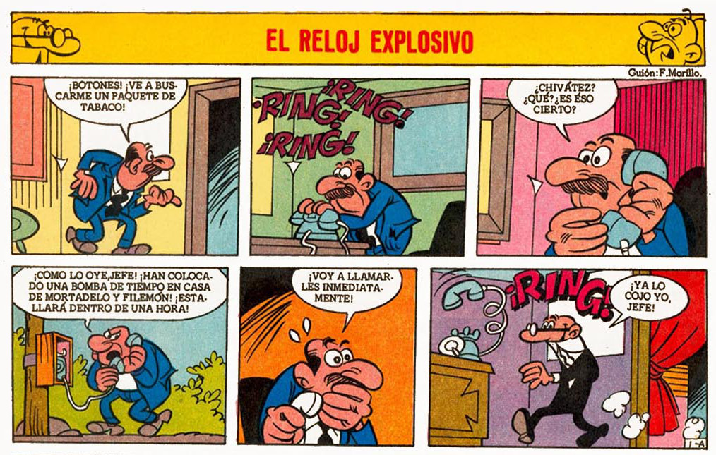 Han colocado una bomba de tiempo en casa de Mortadelo y Filemón y Chivátez comunica esta noticia al Súper, que pide a los agentes que acudan a su despacho inmediatamente para que salgan de su vivienda lo antes posible.
