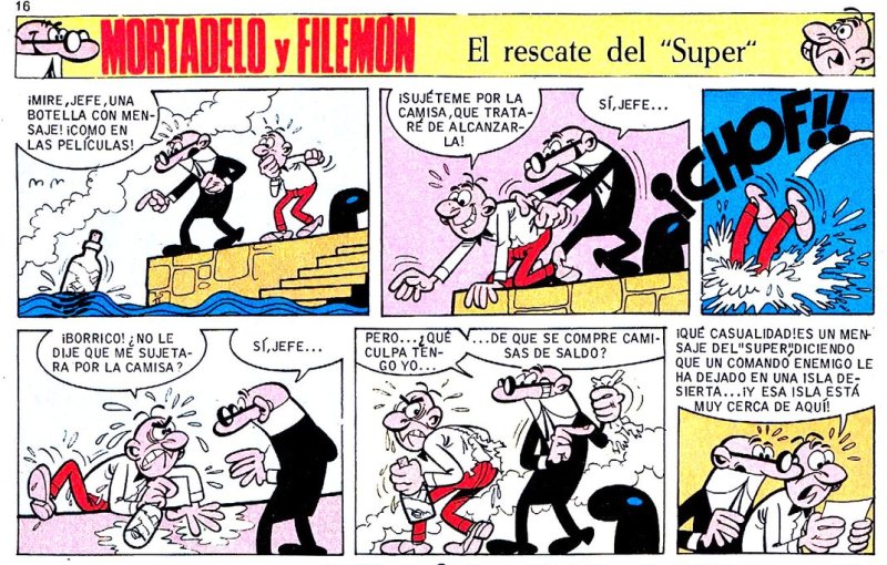 Un comando enemigo a secuestrado al Súper y le ha abandonado en una isla desierta. Los agentes Mortadelo y Filemón encuentran una botella en el mar con un mensaje de auxilio escrito por el Súper y deciden ir en su busca. La historieta está preabocetada por Blas Sanchís y acabada por Antoni Bancells.