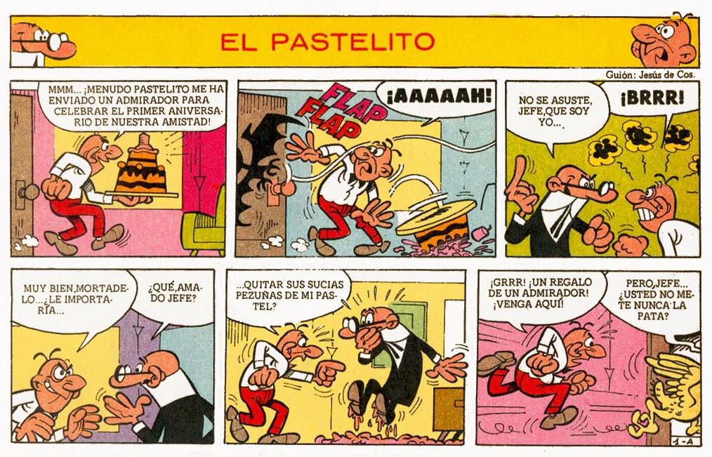 Un admirador ha enviado un pastel a Filemón para celebrar el primer aniversario de su amistad pero Mortadelo lo destruye accidentalmente. Filemón se hace con otro pastel en la tienda pero de nuevo Mortadelo vuelve a acabar con él creyendo que está envenenado...